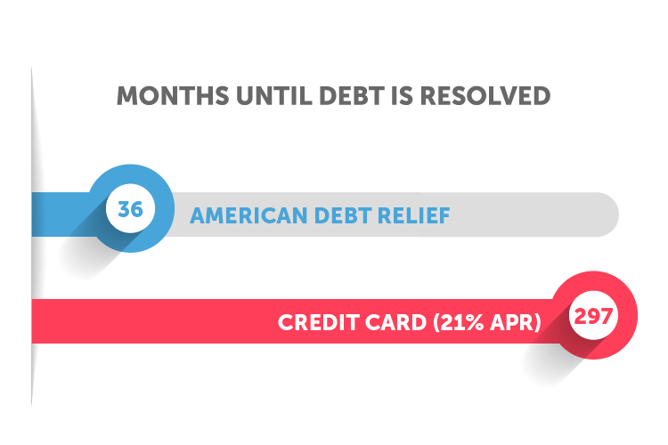 With American Debt Relief, you will pay only a fraction of what you owe and fully resolve your debt in as few as 24-36 months.