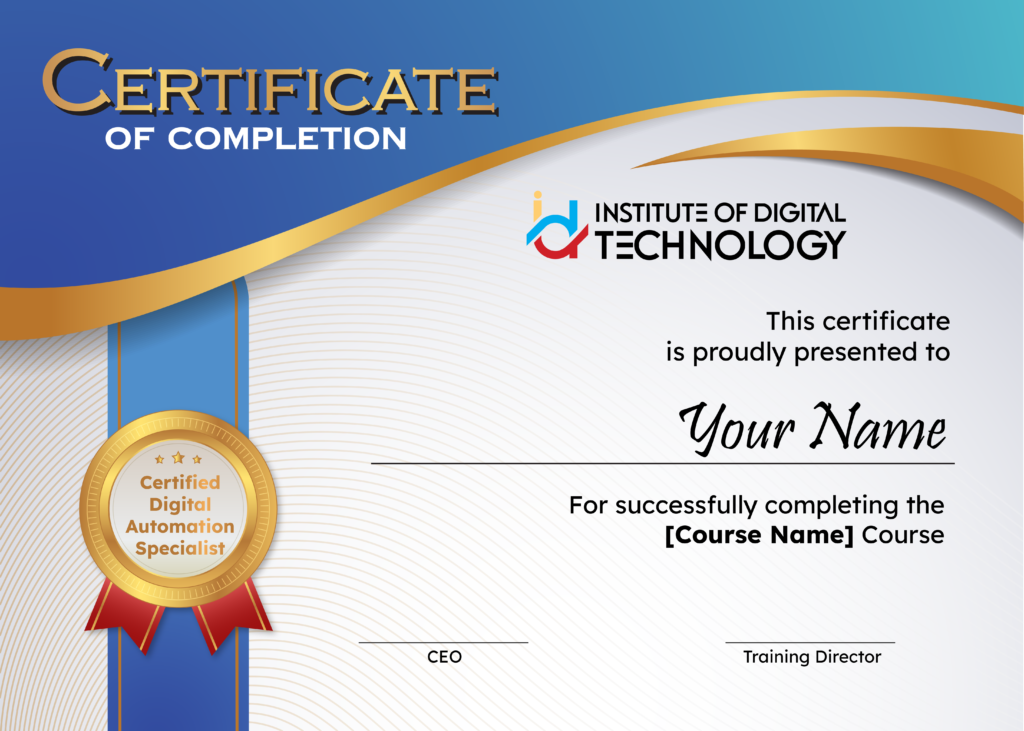 Certification of Completion by IDT will be awarded to candidates who have demonstrated                                                                                       competency in the Digital Marketing & Automation course assessment and achieved at least 90%                                                          attendance.